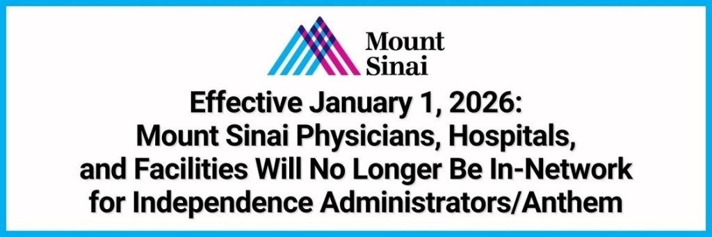 The Hollow Metal Trust Fund has recently been notified that as of January 1, 2026, Mount Sinai physicians, and as of March 1st, 2026, hospitals and facilities will no longer be considered “in-network” for the Welfare Fund’s coverage through Independence Administrators (“IA”)/Anthem. For those of our participants who are impacted by this change, you should note that, per New York law, you can continue to receive “in-network” coverage from Mount Sinai until March 1, 2026. However, after this date, you will need to switch to an “in-network” provider or be charged by Mount Sinai at the “out-of-network” rate.